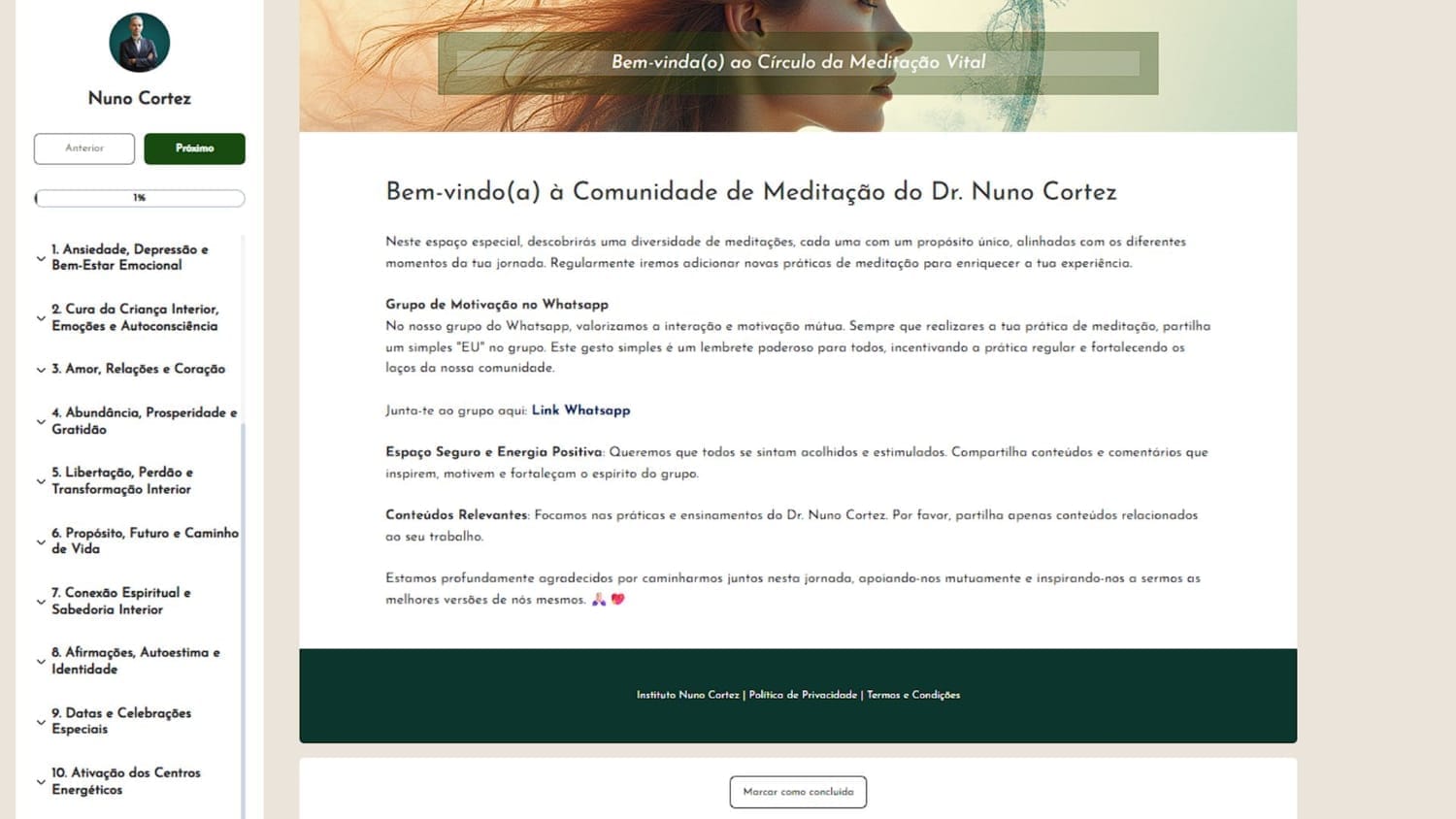 Sentes ansiedade, cansaço ou dificuldade em desligar a mente? O Círculo da Meditação Vital é o teu refúgio semanal: recebes uma nova meditação gravada todas as semanas, acesso imediato a uma biblioteca com mais de 100 práticas e podes partilhar no grupo privado, ao teu ritmo. Sem horários fixos e sem pressões, ao teu ritmo e ao teu tempo.